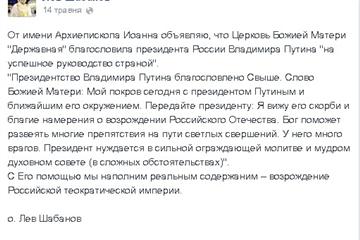 Такий собі російський священик Лев Шабанов, який очолює Православну церкву Божої Матері державну Закарпаття, 14 травня на персональній сторінці в «